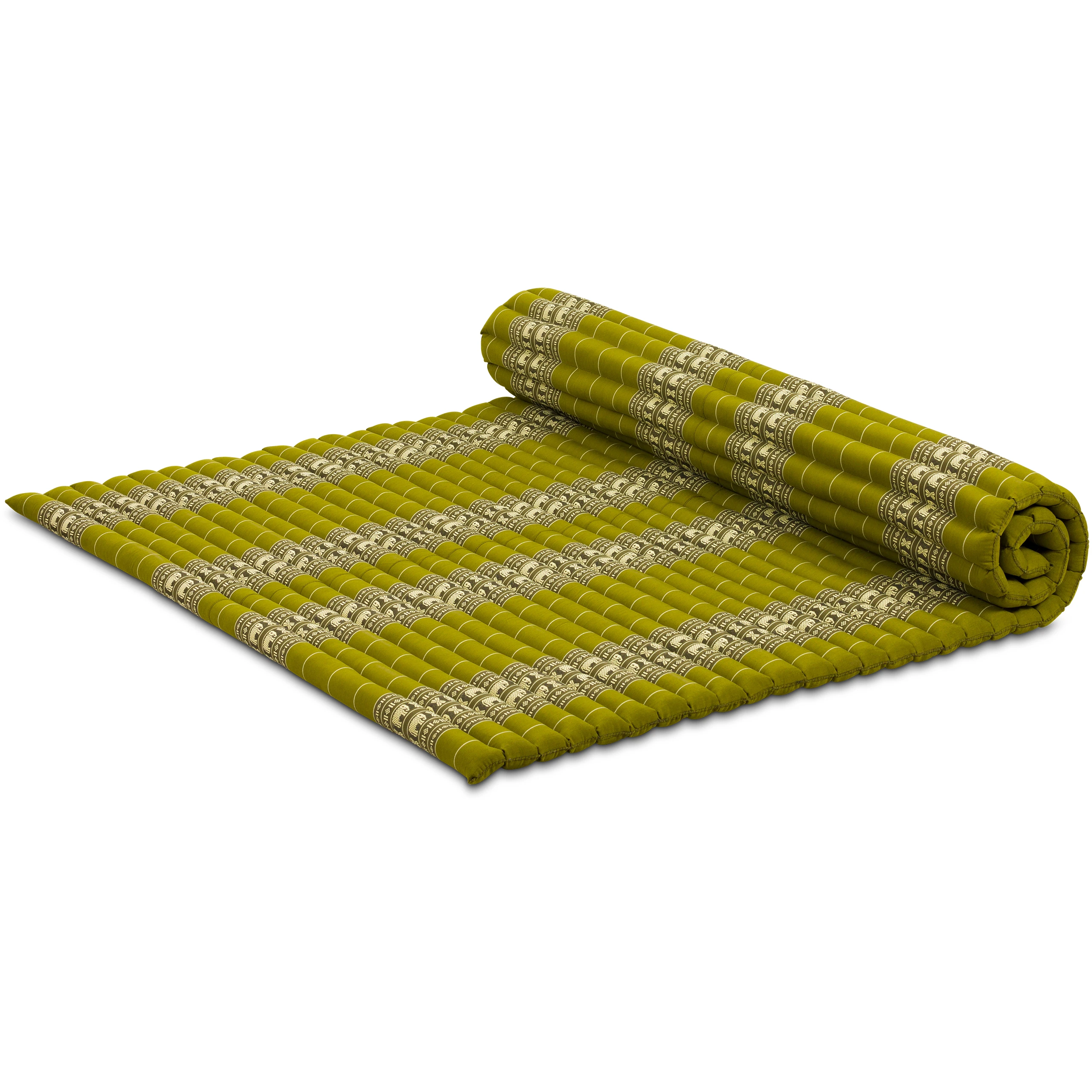 Schön breit für den Schlaf zu zweit! Die Thai Rollmatte XXL dient euch als formfeste und stabile Unterlage für ein gesundes Schlaferlebnis. Sie ist nachhaltig hergestellt und flexibel einsetzbar. Magst du ein cleanes Wohnumfeld fernöstlicher Art? Pflegst du einen minimalistischen Lebensstil? Dafür ist die Kapok Rollmatte aus Thailand wie geschaffen. Sobald die Müdigkeit kommt: Einfach an Ort und Stelle ausklappen. Tagsüber kannst du sie zusammenrollen, mit der Kordel praktisch verschnüren und platzsparend wegstellen. Oder nutze sie als Bodensofa. Einfach mit Kissen ergänzen – fertig! Die farbenfrohen Muster verschönern deinen Wohnraum. Verwende sie als Liege- und Spielwiese für deine Kinder, als Meditationsmatte oder für deine Yogaübungen. Auf der sommerlichen Terrasse dient die Kapok Rollmatte XL zum Faulenzen und Entspannen. Perfekt ist die Thai-Matte von livasia zudem für Urlaubsreisen. Im Van oder Campingzelt ist sie die perfekte Matratze. Sogar im Freien kannst du sie ausrollen und auf Feld und Wiese schlafen.